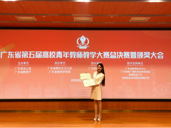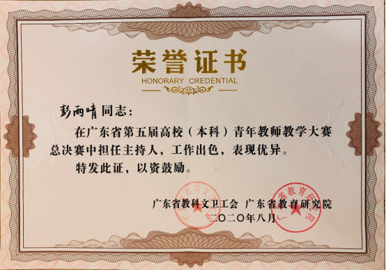 第十届青年教师课堂教学竞赛中荣获社会科学组第一名,由学校推荐参加广东省第五届高校(本科)青年教师教学大赛。省赛前经过竞赛研修工作坊、分阶段备赛培训等环节,最后在省赛中,彭雨晴老师一路过关斩将,在网络评选、现场决赛等环节中脱颖而出。