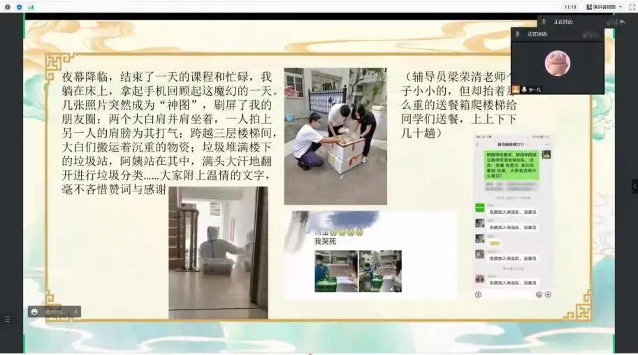 其中,学院田秋生院长作为广电221的第一班主任,在广电221的班会上向同学们分享了在学校封闭管理期间自我调整的做法:首先,要保持良好的心态,做好充分的足够的心理准备,调整好自己的心态,沉着应对未来的困难挑战。封控的本身是一个难得的经历,遵守学校规章制度的同时,大家可以通过音视频、文字等方式记录生活,这也是对个人成长过程的记忆;其次,多读书,认真听课;此外,作为成年人,同学们应当积极为校园与社会承担责任,共克时艰;最后,同学间、师生间可以组织线上交流活动,远离负面情绪。