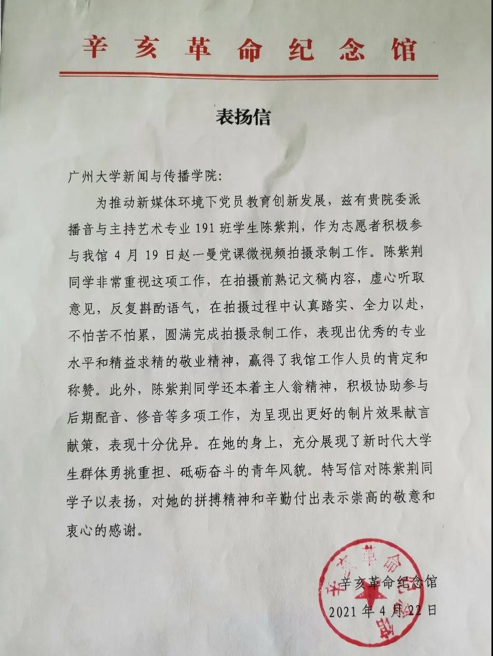 积极支持和协助辛亥革命纪念馆的党课微视频拍摄工作,选择并委派了播音与主持艺术专业191班学生陈紫荆作为志愿者,于4月19日参与赵一曼党课微视频拍摄工作。在拍摄过程中,陈紫荆同学表现出认真负责的态度和精益求精的敬业精神,全力以赴,不怕苦不怕累,最终圆满完成拍摄录制工作。此外,陈紫荆同学本着主人翁精神,积极协助参与后期配音、修音等各项工作,为呈现出更好的制片效果建言献策,赢得了馆内工作人员的肯定和称赞。