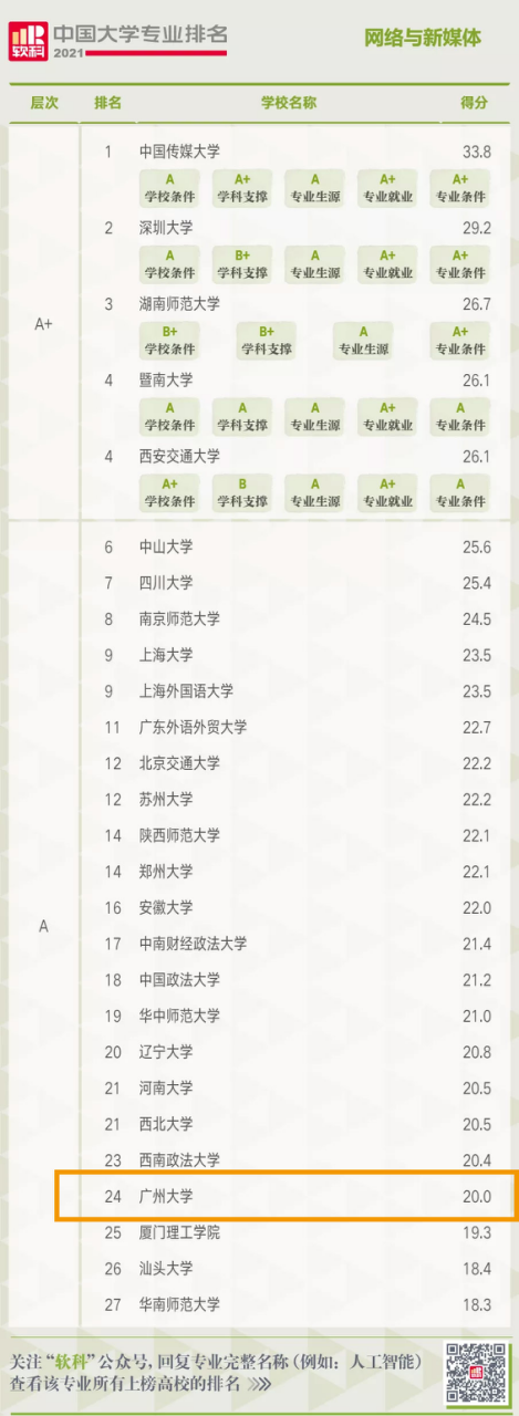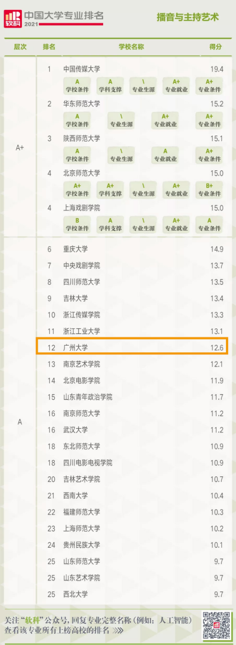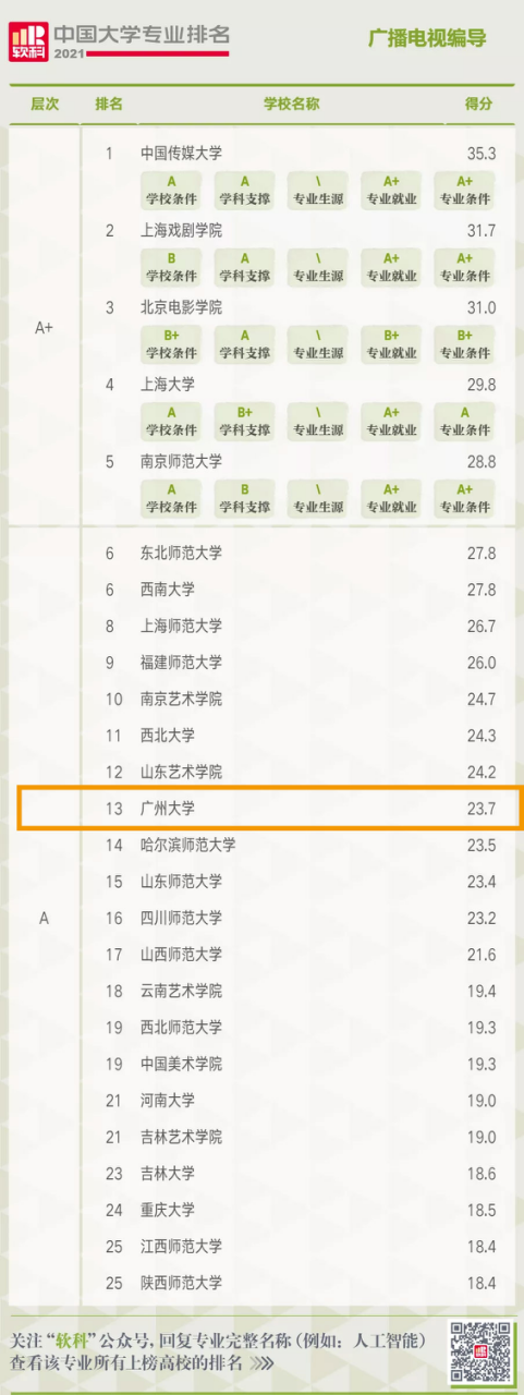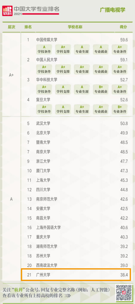2021年6月22日,高等教育评价专业机构软科正式发布2021“软科中国大学专业排名”,我校共22个专业上榜A层次专业排名。其中,我院4个专业悉数获得A层次排名,分别是:播音与主持艺术、广播电视编导、广播电视学、网络与新媒体。