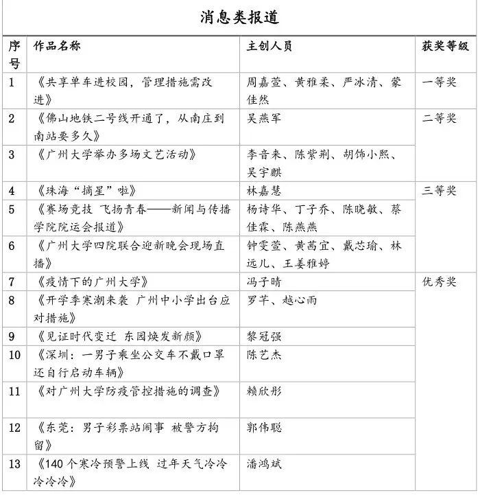 本次大赛共收到投稿作品50余部,分为消息类作品和专题类作品两个组别,评委围绕《电视新闻学》的教学要求,从选题价值、新闻策划、记者采访能力、画面和声音的运用能力,以及视频拍摄水平及后期制作质量等几个评判维度对作品进行了综合打分,现将获奖名单公布如下: